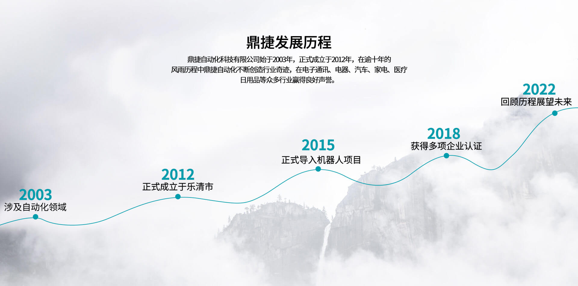 公司始于2012年,在逾十年的風(fēng)雨歷程中,不斷創(chuàng)造行業(yè)奇跡,在電子通訊、電器、汽車、家電、醫(yī)療、日用品等眾多行業(yè)贏得良好聲譽(yù)。公司坐落于浙江省樂清經(jīng)濟(jì)開發(fā)區(qū),現(xiàn)有人員63人,擁有經(jīng)驗(yàn)豐富的工程技術(shù)研發(fā)團(tuán)隊(duì)11人,其中高級(jí)工程6人,具備本科以上學(xué)歷高級(jí)工程人員比例78%;同時(shí)鼎捷自動(dòng)化在蘇州,東莞等地設(shè)立分公司以服務(wù)目標(biāo)市場(chǎng)客戶,目前鼎捷自動(dòng)化已經(jīng)為下客戶提供配套自動(dòng)化解決方案:泰科、安費(fèi)諾、莫士、華為、中興、普聯(lián)、智英、意華、德豐、公牛、萬(wàn)事達(dá)、華豐、飛雕、普思、冠聯(lián)、俊朗松田、進(jìn)聯(lián)、高正、盛凌等。鼎捷自動(dòng)化專業(yè)從事連接器、開關(guān)及相關(guān)電子、電器、五金、塑膠產(chǎn)品組裝自動(dòng)化定制、設(shè)計(jì)、制造、銷售。2012年,鼎捷自動(dòng)化正式導(dǎo)入機(jī)器人應(yīng)用項(xiàng)目,可為各類客戶提供電子、電器、汽車、五金、塑膠等集成自動(dòng)化智能組裝系統(tǒng)。